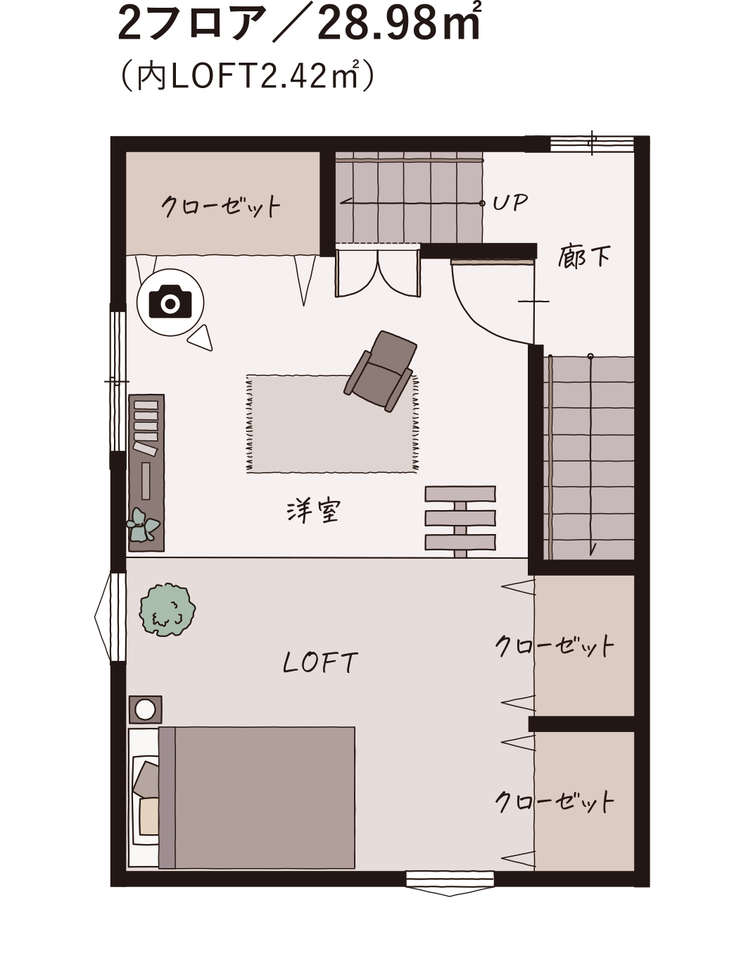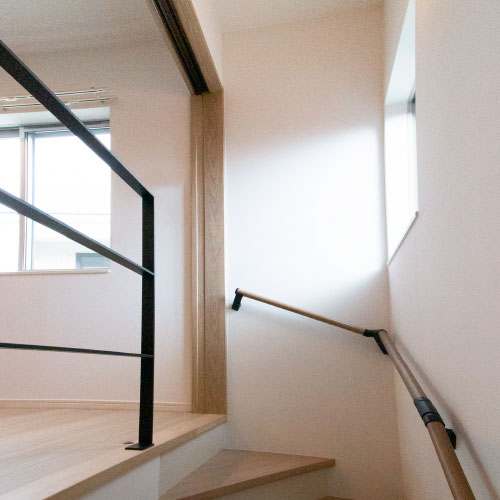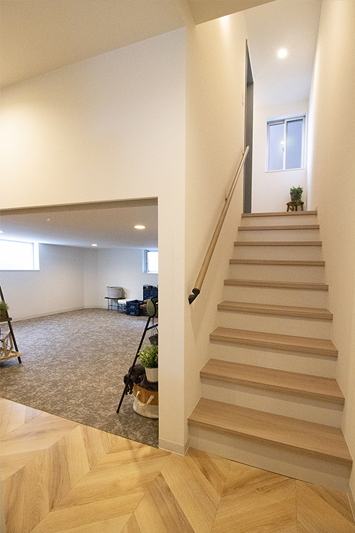 玄関を入ってすぐ大容量つまえる空間、階段を上がってロフト付き洋室、