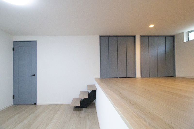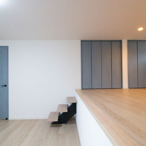 1階一部をつまえる空間(天井高140cm)、その上部を洋室、さらに上部をLDKとした