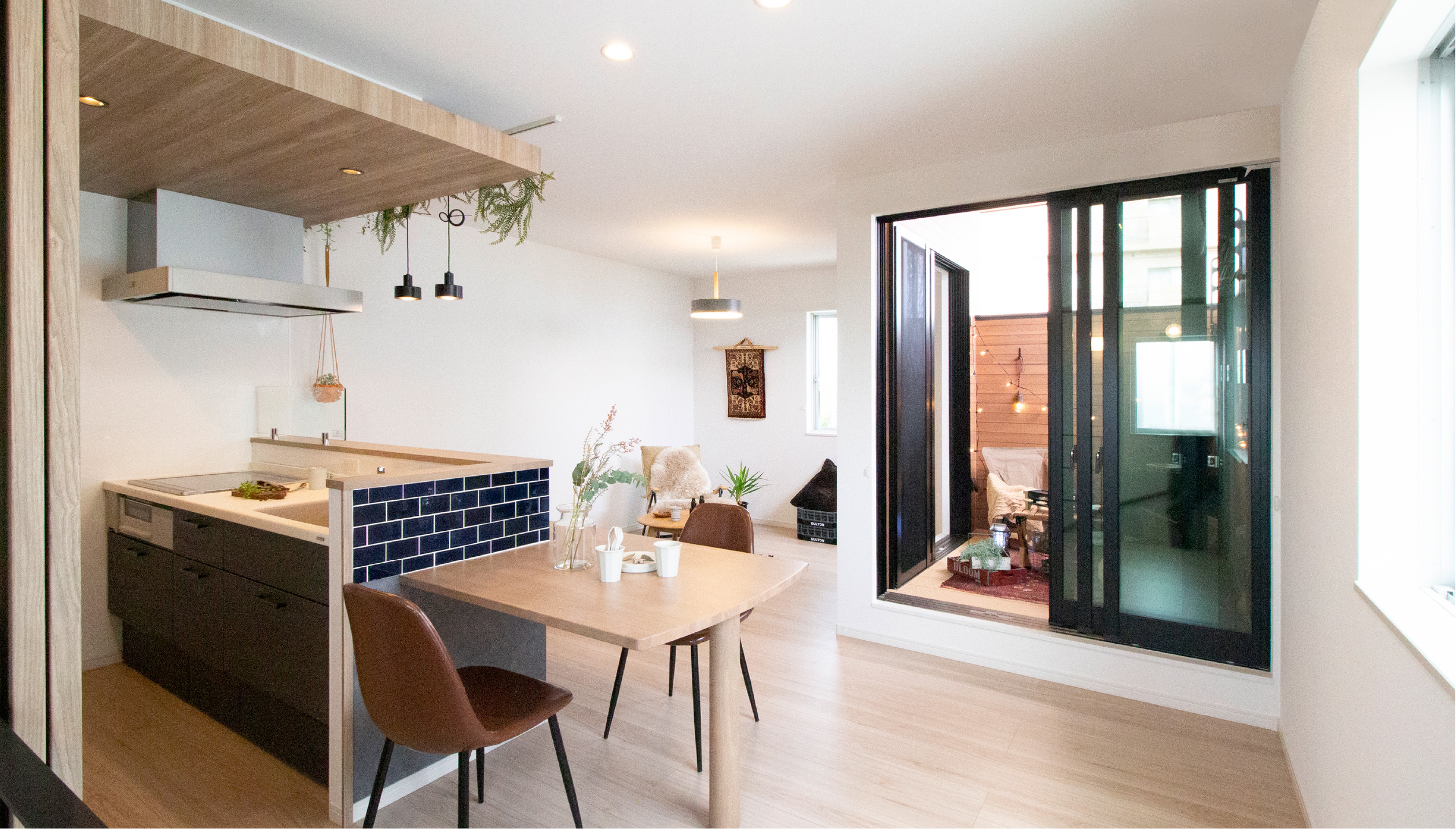 柱も仕切り壁もなく開放的です。木目天井壁で守られたインナーバルコニーや