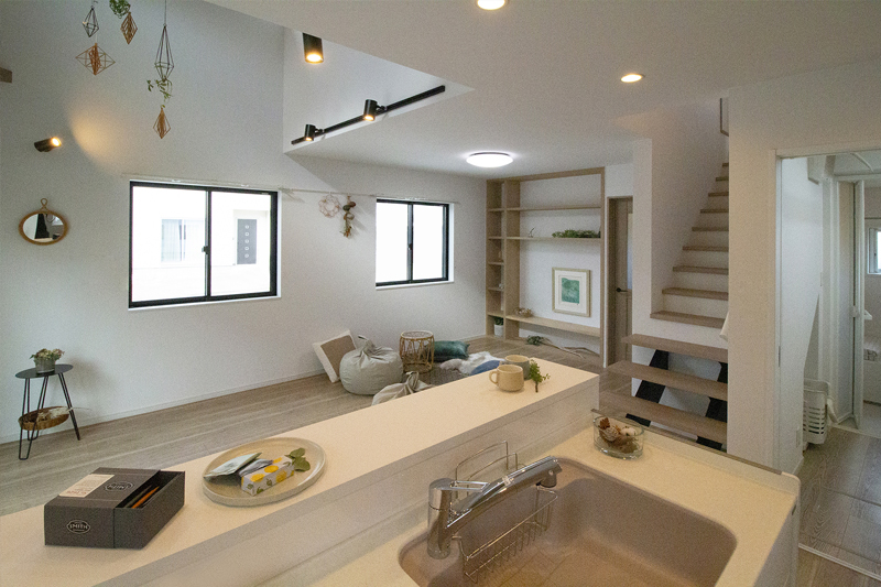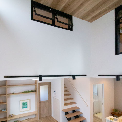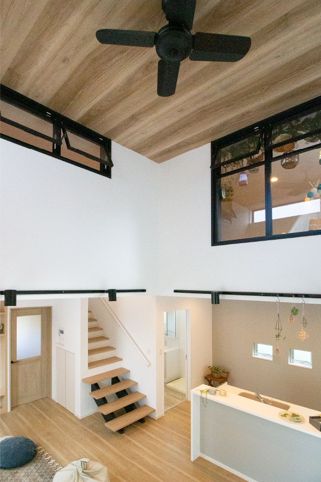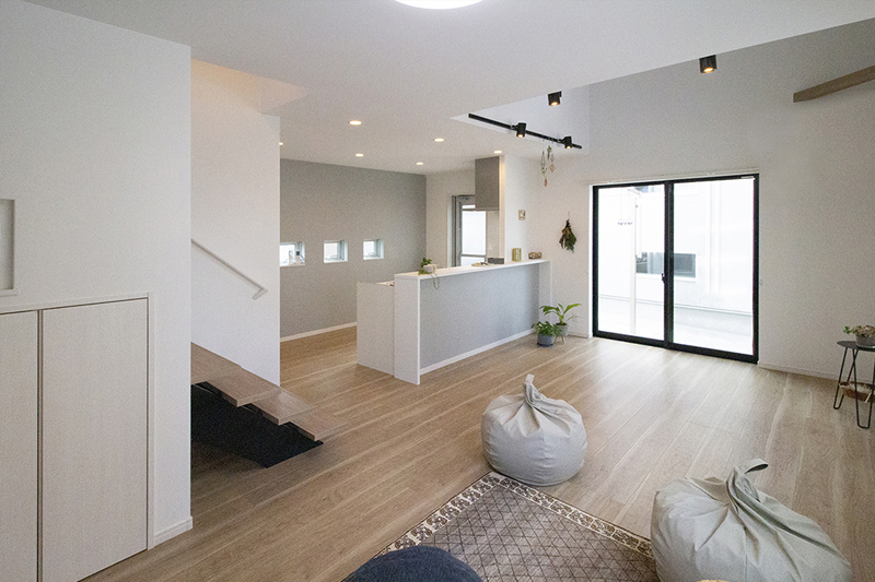 吹き抜けLDKとつまえる空間は室内窓でつながり、